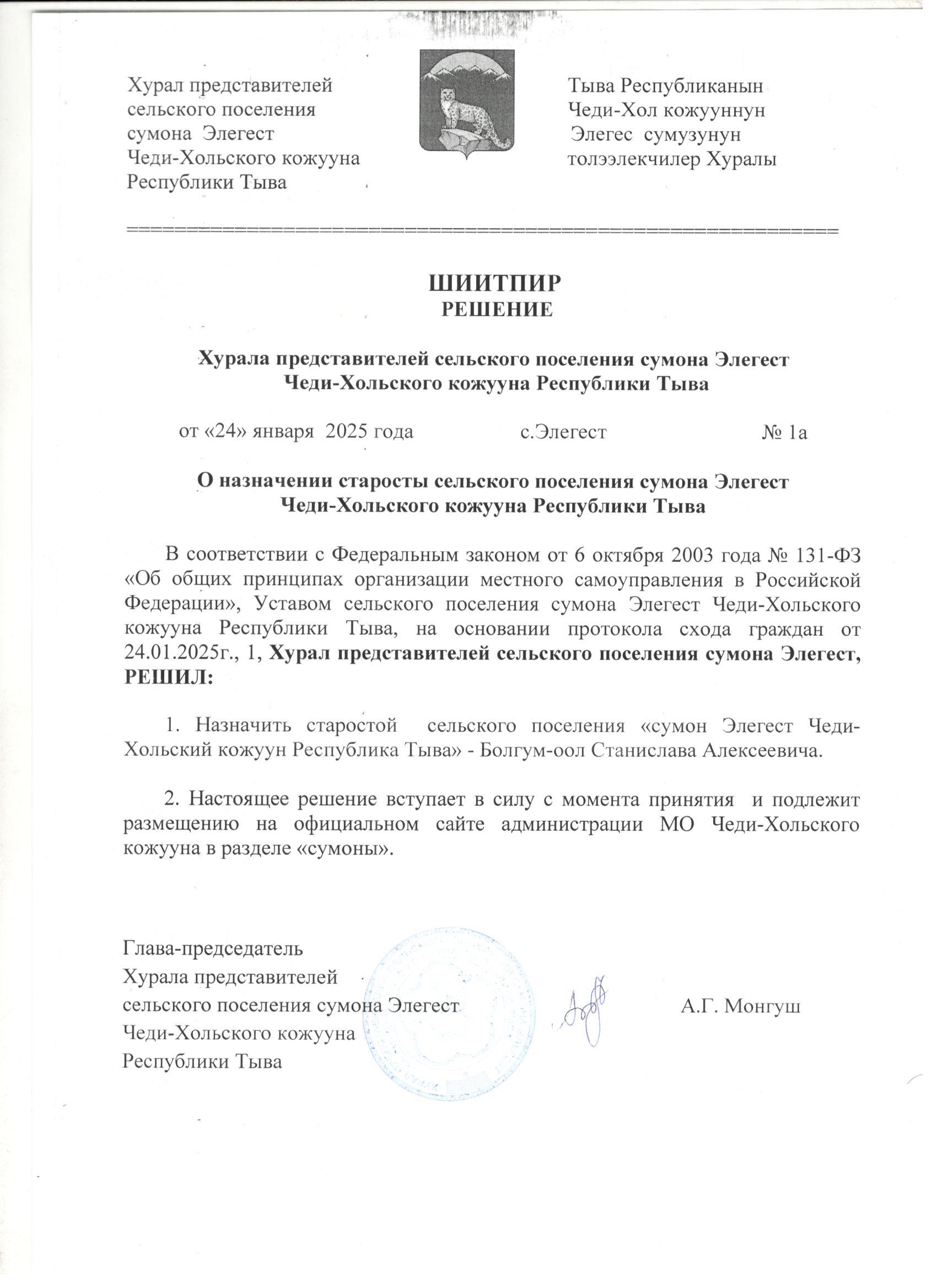 - Решение № 1а от 24.01.2025 года О назначении Старосты сумона Элегест, JPG, 280,3 KB